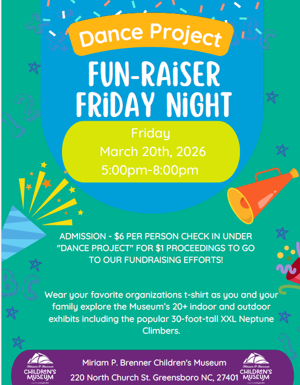 5-8pm Join us at the Greensboro Children’s Museum! Explore the museum and help our fundraising efforts–$1 from each general admission comes back to Dance Project! Be sure to tell the front desk you’re with us, and bring friends and family members!
