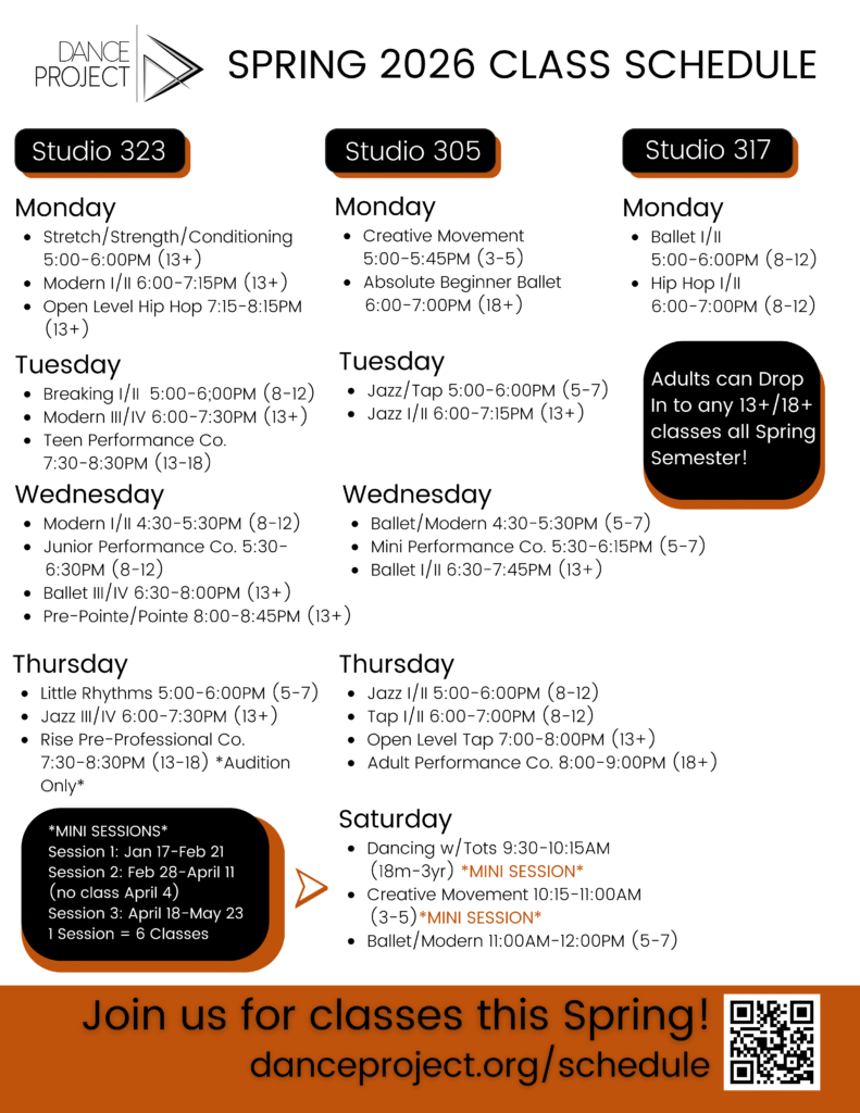 Find our full Spring class schedules, for all ages, below. Youth and teens (13-18) register for a class for the full semester. Adults (18+) may drop into any class listed as 13+ or 18+. Multi-class passes are also available for adult students.